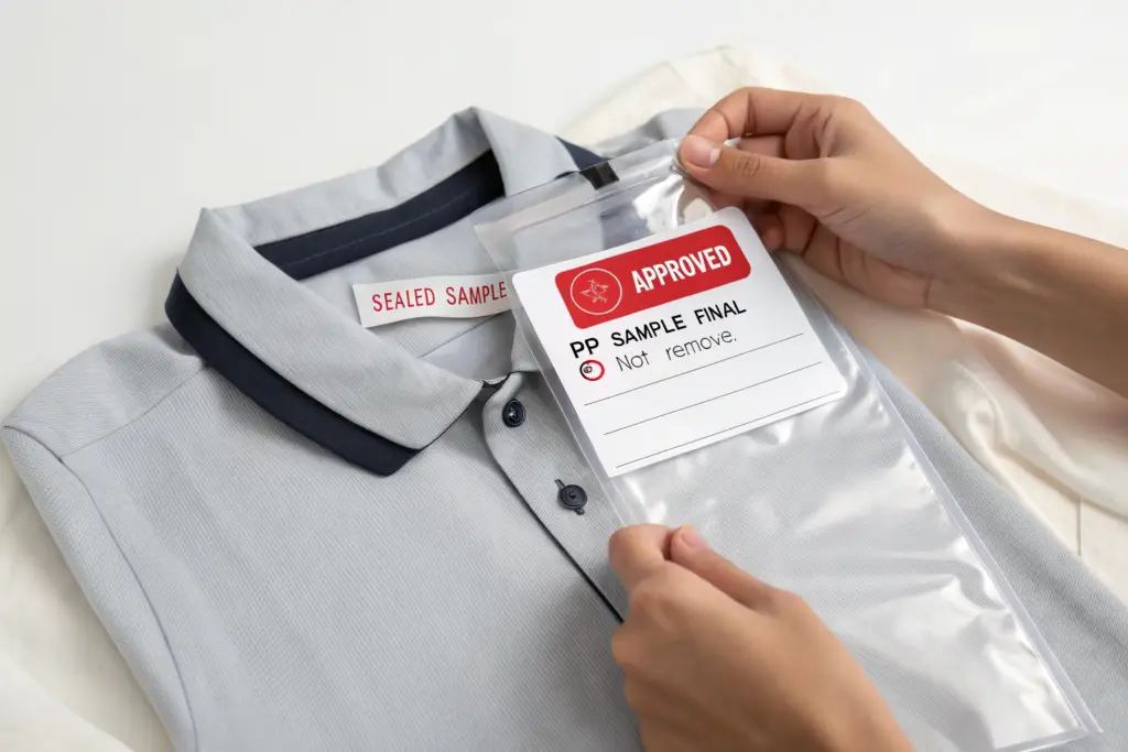 The PP (Pre-Production) Sample, often called the Golden Sample, is the final, fully approved prototype. It is made from the actual bulk fabric with all correct trims and construction details. Once approved by the brand, it is "sealed" in a tamper-proof bag and becomes the legal and visual standard against which all bulk production will be inspected. It is the single source of truth for quality control.
